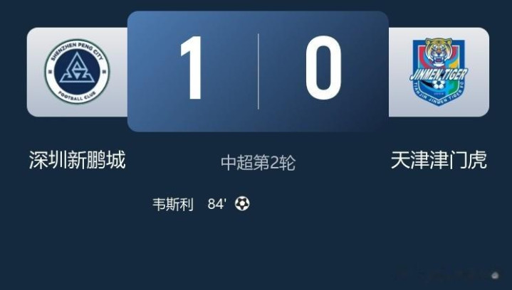 上半场比赛两边0-0打平,下半场款式依旧千里闷直到第84分钟津门虎门将,皆雨熙出击造作,韦斯利打佛门平直,深圳新鹏城1-0津门虎取得跳动,过程90分钟战争,深圳新鹏城1-0送津门虎两连败。