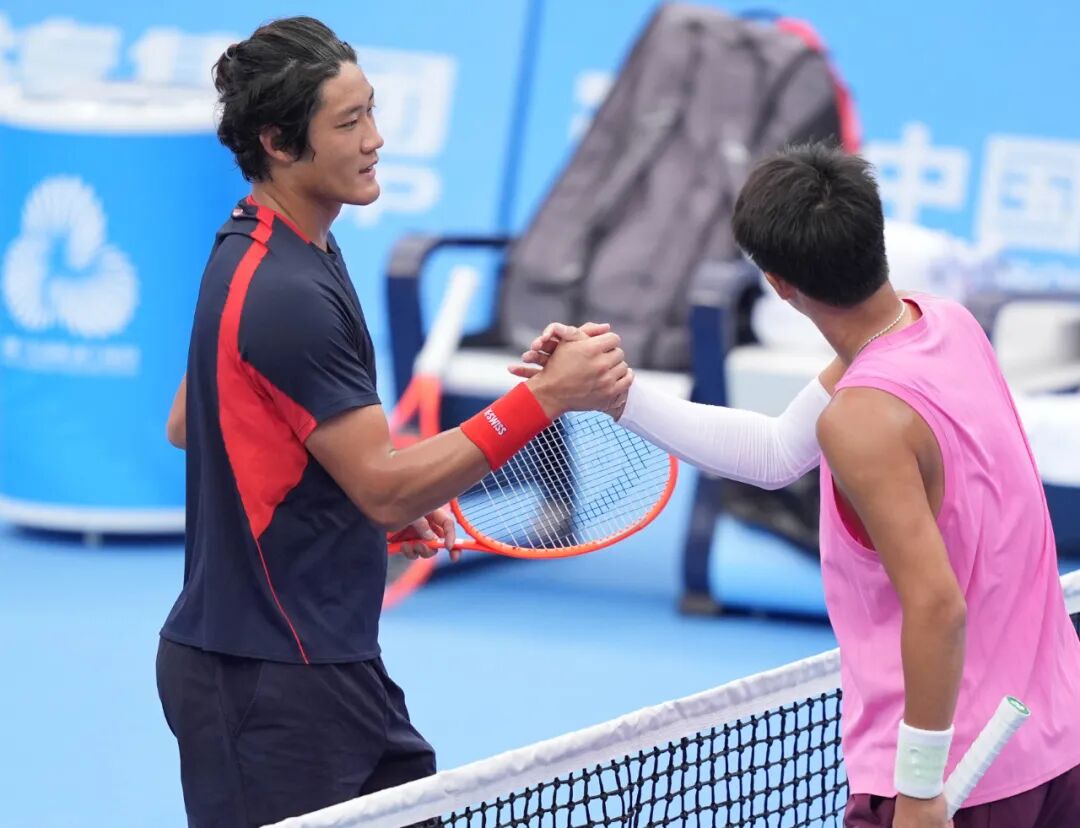11月13日,第十五届天下领导会网球姿色须眉单打第一轮在珠海横琴举行。上海队选手张之臻(左)与湖南队选手周洺舟在赛后持手问候。