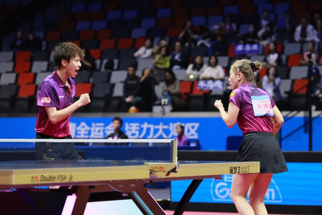 11月14日,第十五届天下领导会乒乓球羼杂双打决赛上的林高远和刘诗雯。