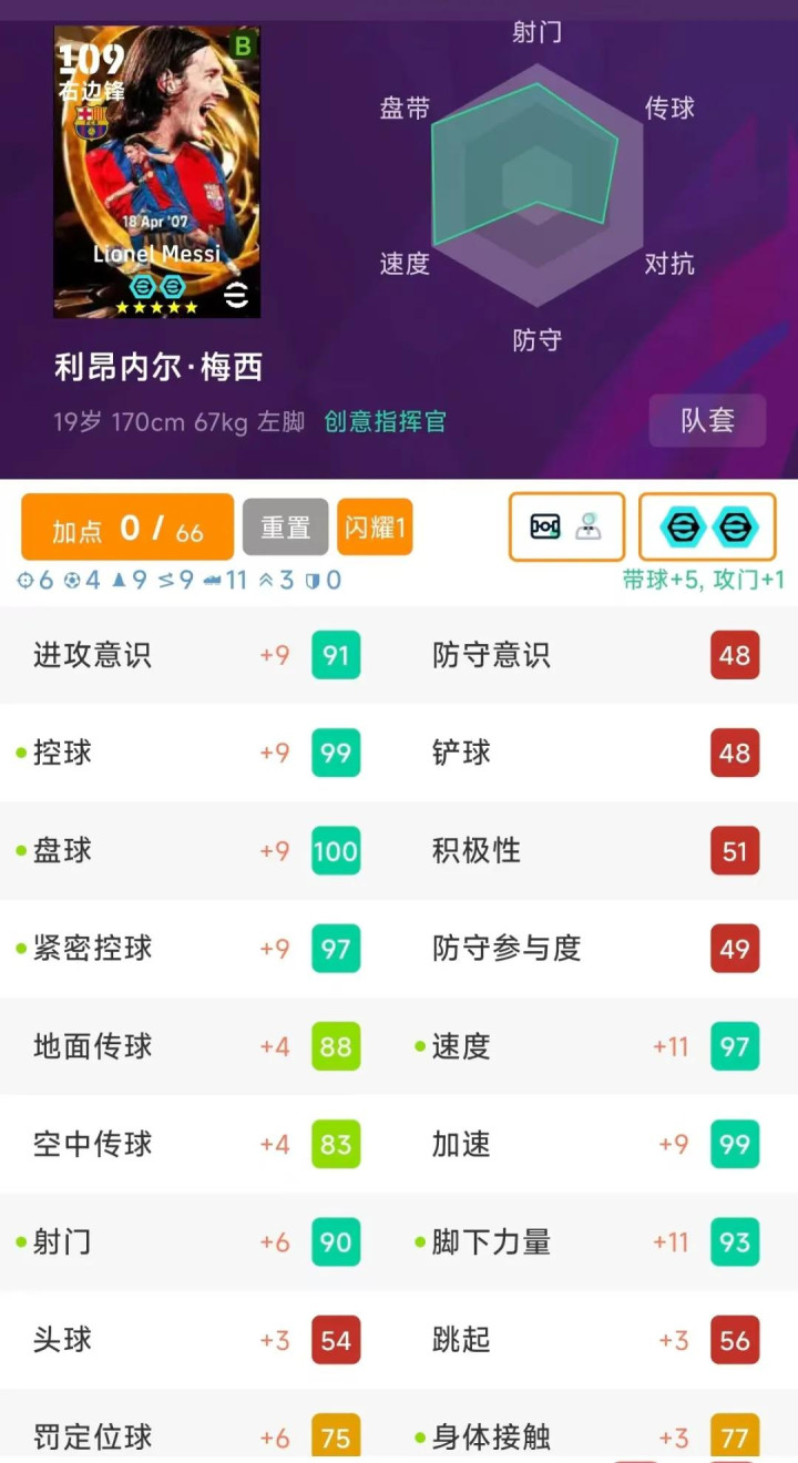 双速和三盘简直全99了,射门90,传球还不差,躯壳战斗也能加到75以上,自带的手段是旋风盘带和金搓,貌似除了创指的立场,没啥舛错了。