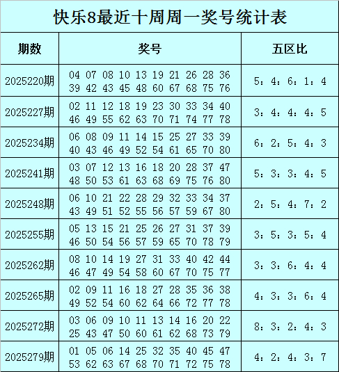福彩雀跃8第2025279期(上周一)开奖回归:01 05 06 14 25 32 35 40 45 47 53 62 63 67 68 70 71 72 75 78,其中奖号五区比为4:2:4:3:7。