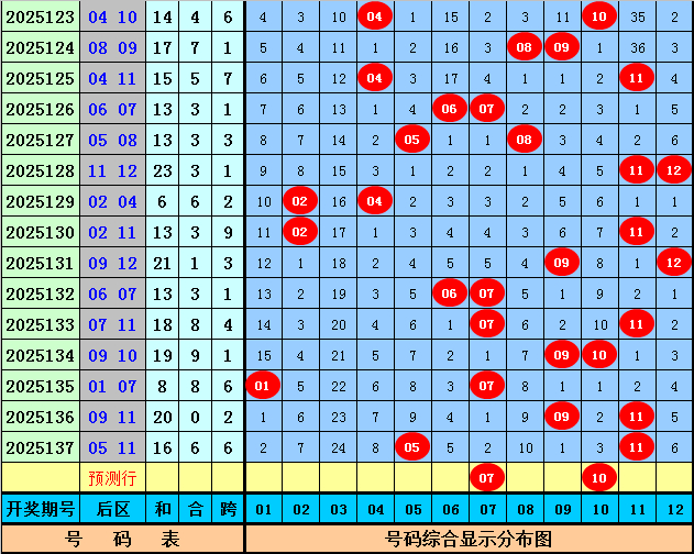 后鉴别析(一区01-04,二区05-08,三区09-12):上期后区开出奖号05和11,最近10期后区三区落号比为4:8:11,本期后区关爱号码02、04、07、08、10,后区两码参考07、10。