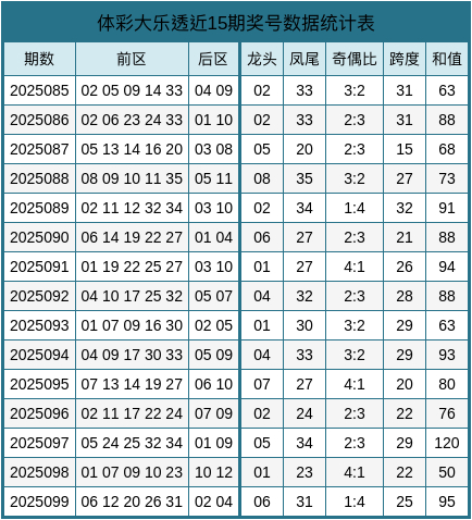 其中龙头号码为06,凤尾号码为31,跨度为25,和值为95。