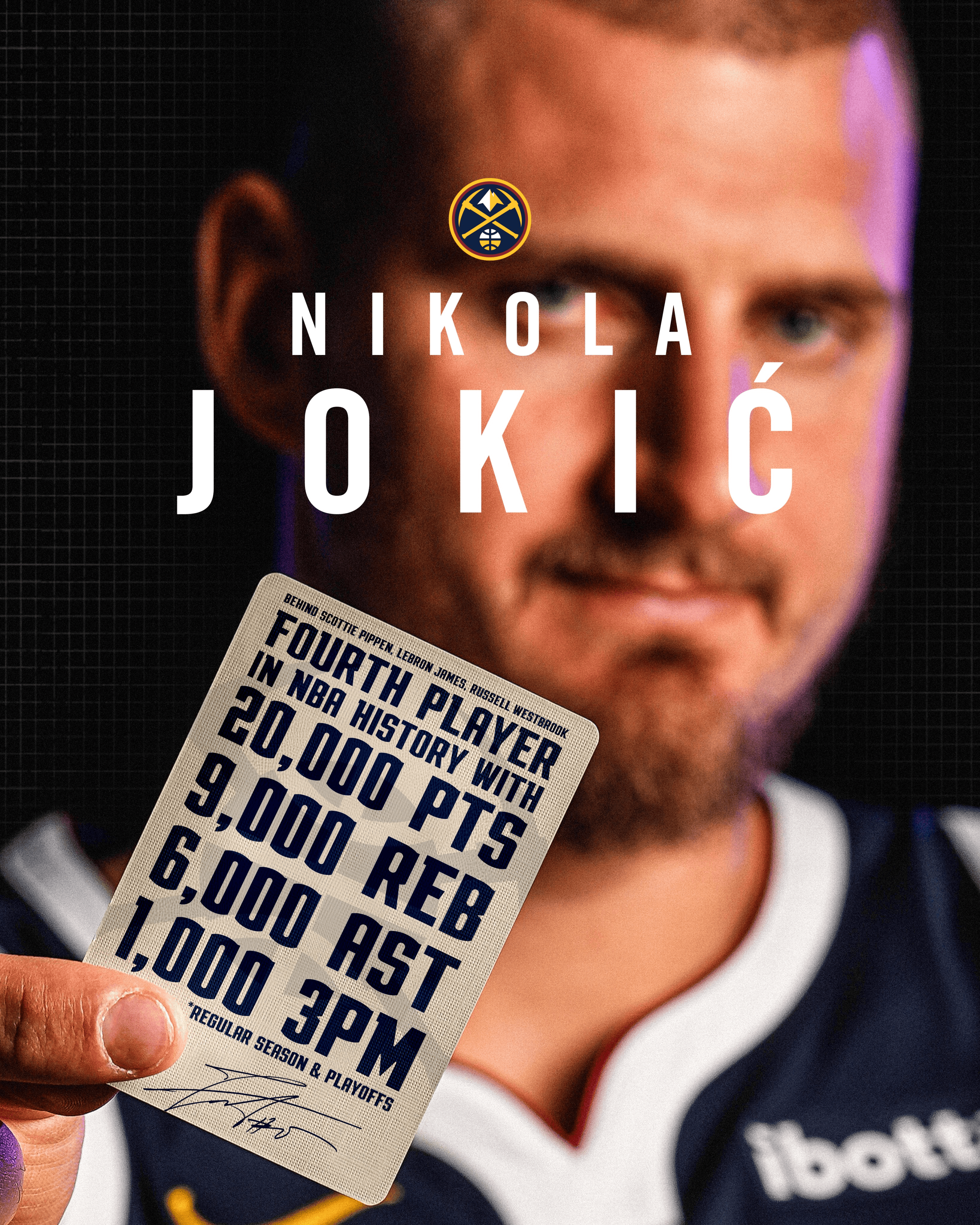 掘金官方共享数据:约基奇成为历史第四位老例赛+季后赛策画拿到20000分9000篮板6000助攻1000三分的球员,前三位是皮蓬、詹姆斯、威少。